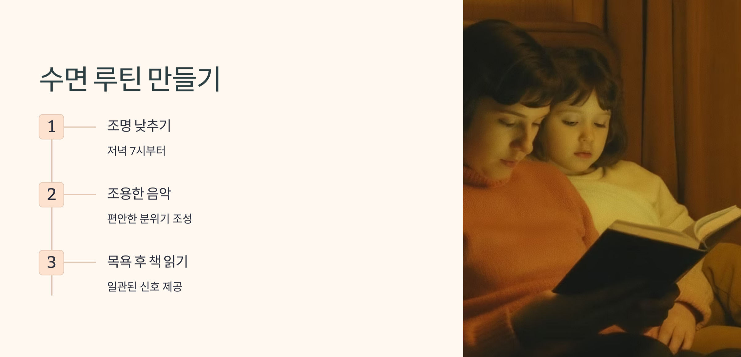수면교육의 핵심은 '루틴'입니다. 매일 같은 시간에 같은 방식으로 수면 환경을 만들어주는 거예요. 예를 들어, 저녁 7시쯤부터는 조명을 낮추고, 조용한 음악을 틀어주며, 목욕 후 책 읽기를 해주는 식으로요. 이런 일관된 루틴은 아이에게 '이제 잘 시간'이라는 신호를 줍니다. 실제로 수면 루틴을 도입한 후 1주일 이내에 아이가 스스로 눈을 감는 모습을 경험하신 부모님들도 많아요 ✨